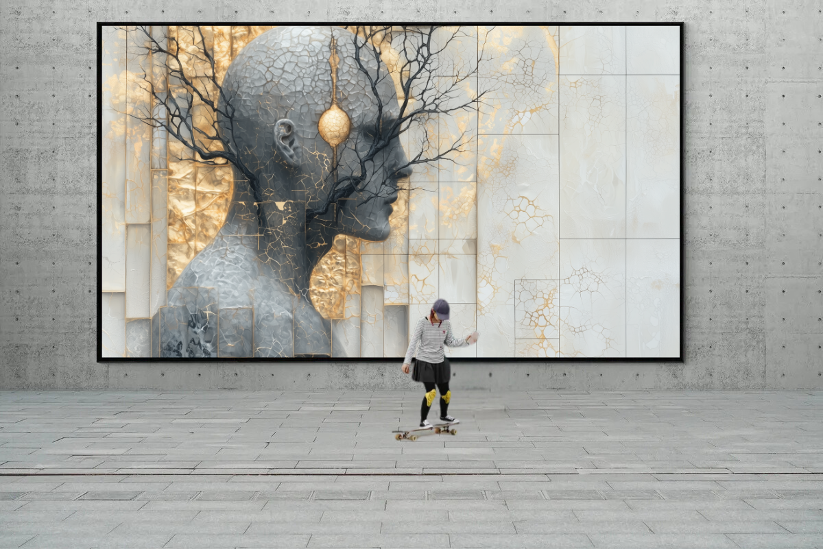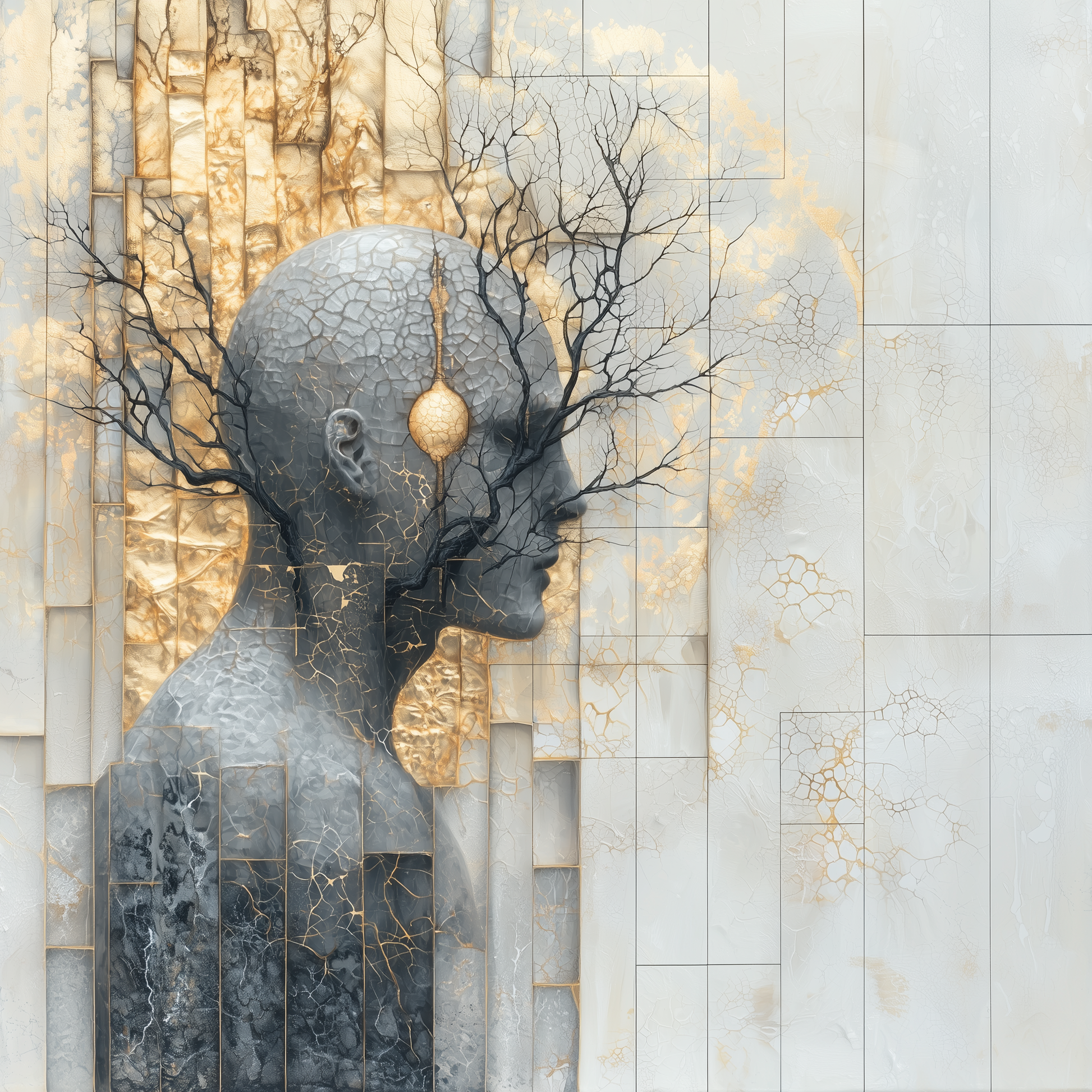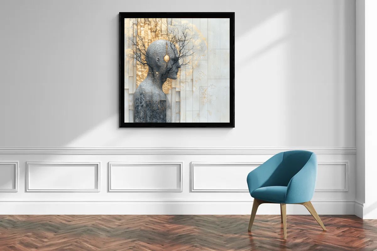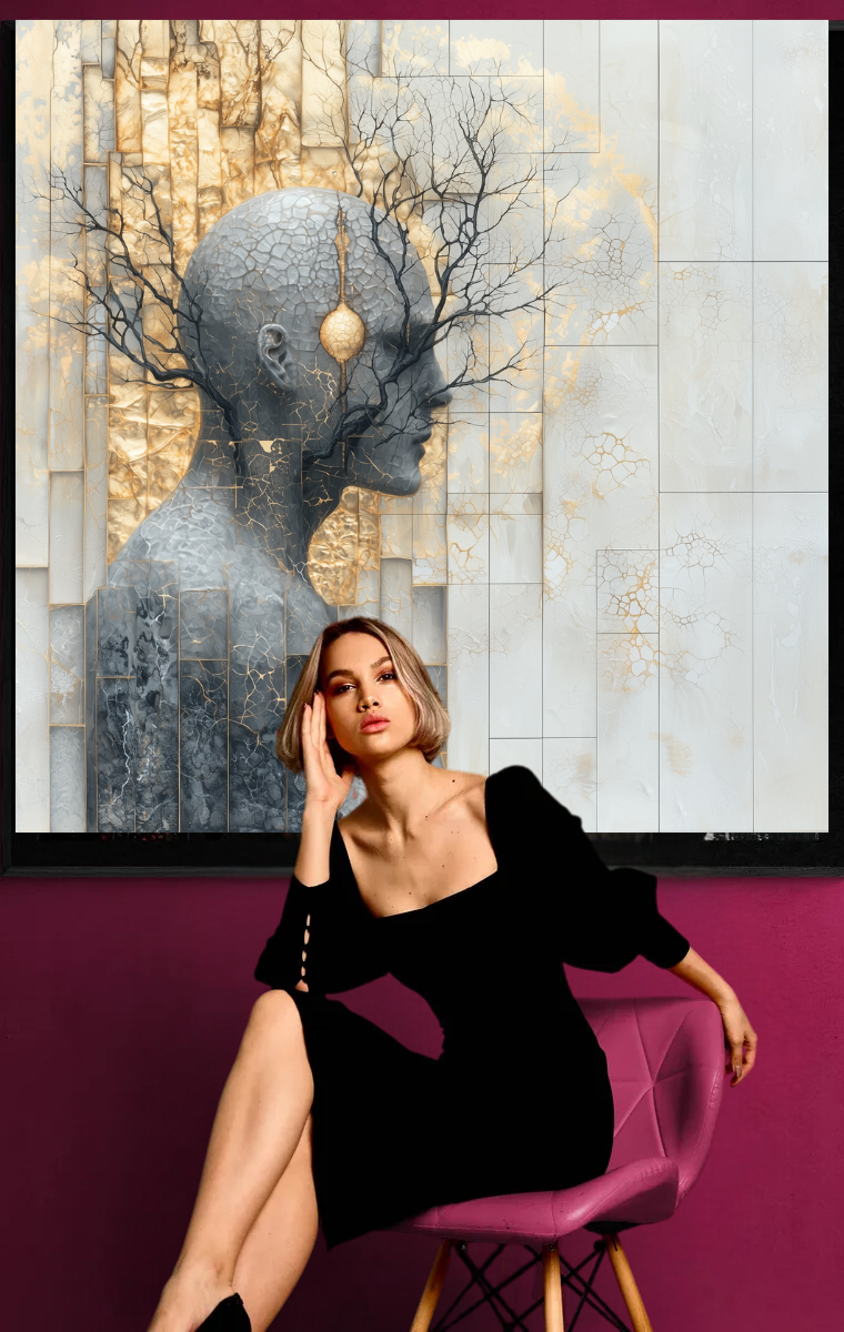 Dieses faszinierende Kunstwerk ist eine visuelle Darstellung der tiefen Verbindung zwischen menschlichem Denken und den organischen Rhythmen der Natur. „Verzweigte Visionen“ zeigt eine menschliche Silhouette, die mit goldenen und schwarzen Ästen verwoben ist, und lädt den Betrachter ein, die Harmonie zwischen der inneren und der äußeren Welt zu entdecken.