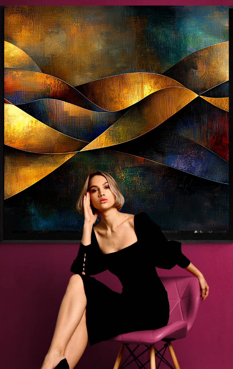 „Wellen der Ewigkeit“ lädt den Betrachter ein, die Schönheit und Harmonie der Natur durch abstrakte Formen und Farben zu entdecken. Die goldenen, die sich in einer fließenden Bewegung entfalten, symbolisieren die Unendlichkeit des Lebens und die Verbindung zwischen Licht und Dunkelheit.