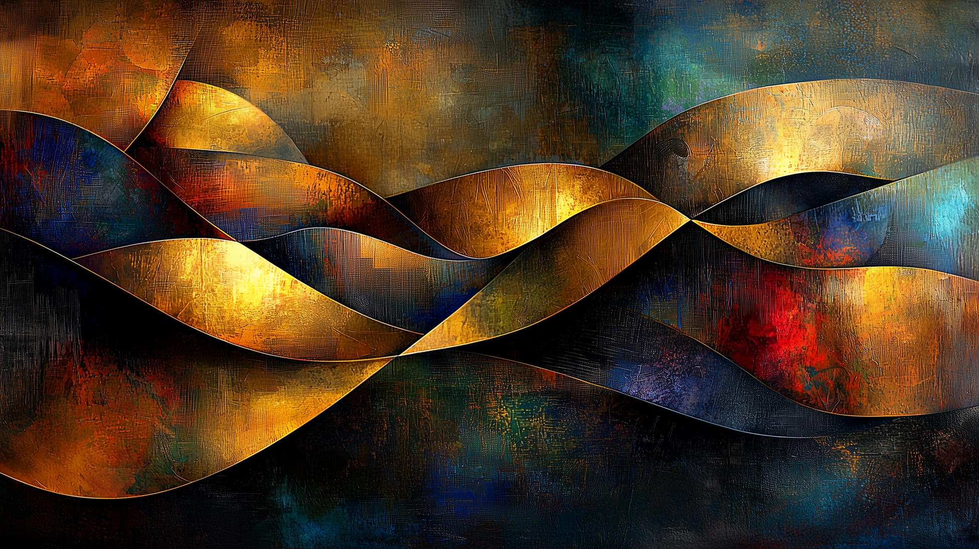 - Farblich abgestufte Hintergründe: Ein harmonisches Zusammenspiel aus warmen Goldtönen und kühlen, dunklen Blau- und Rottönen, die die Tiefe und Dimensionen des Bildes betonen.