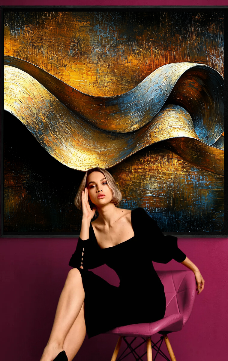 Mit „Wellen des Goldes“ holen Sie ein Kunstwerk in Ihrem Zuhause, das Bewegung und Stil in einer fesselnden Komposition vereint. Es ist ein Sinnbild für Eleganz und zeitlose Schönheit – ein Blickfang für jeden Raum.