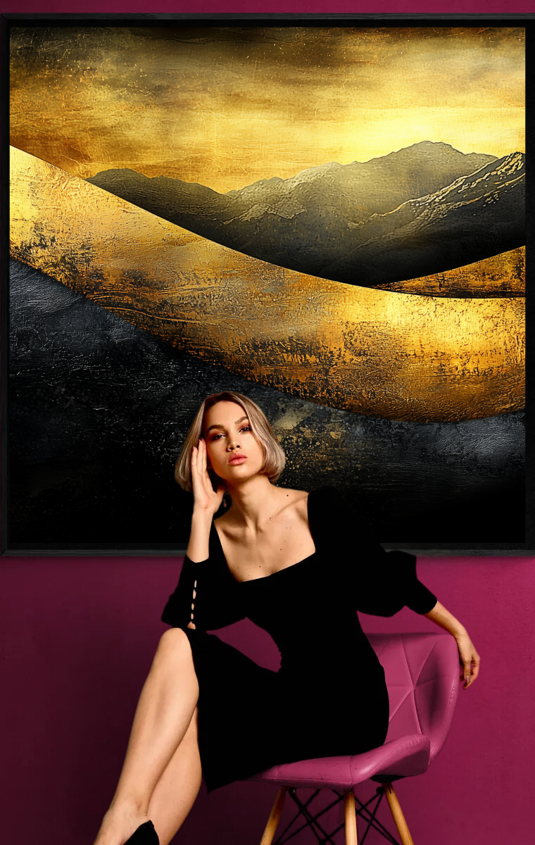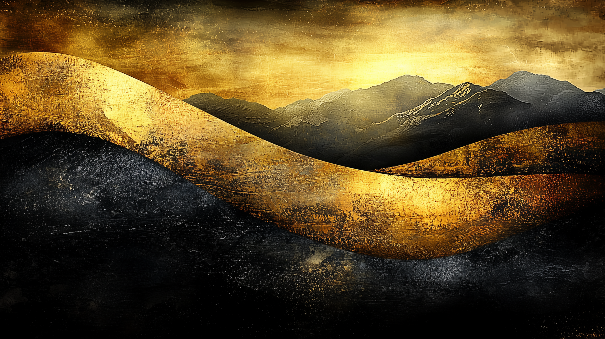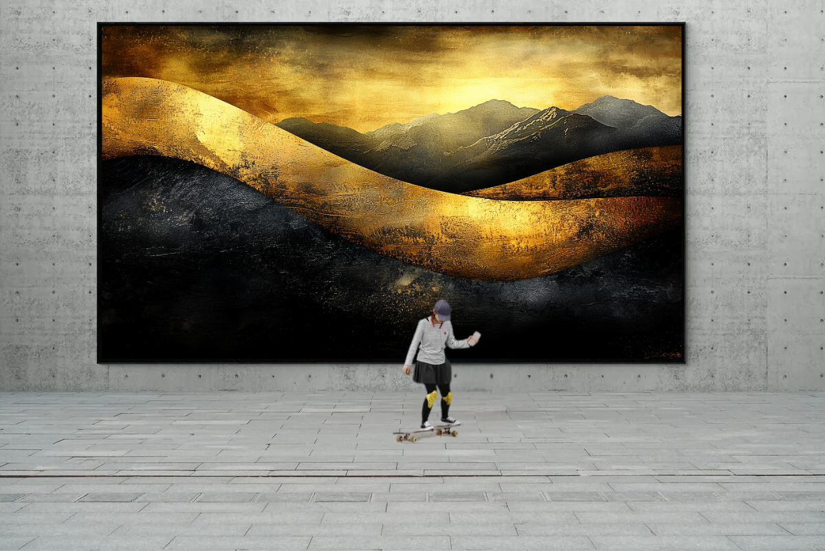 „Wellen des Lichts“ ist ein fesselndes Kunstwerk, das die Dynamik von Bewegung und die Ruhe der Natur in einer meisterhaften Komposition vereint. Die geschwungenen goldenen Linien symbolisieren die Verbindung zwischen der festen Erde und dem endlosen Himmel, während die düsteren Säulen einen starken Kontrast schaffen, der die Kraft und Eleganz der Natur einfängt.