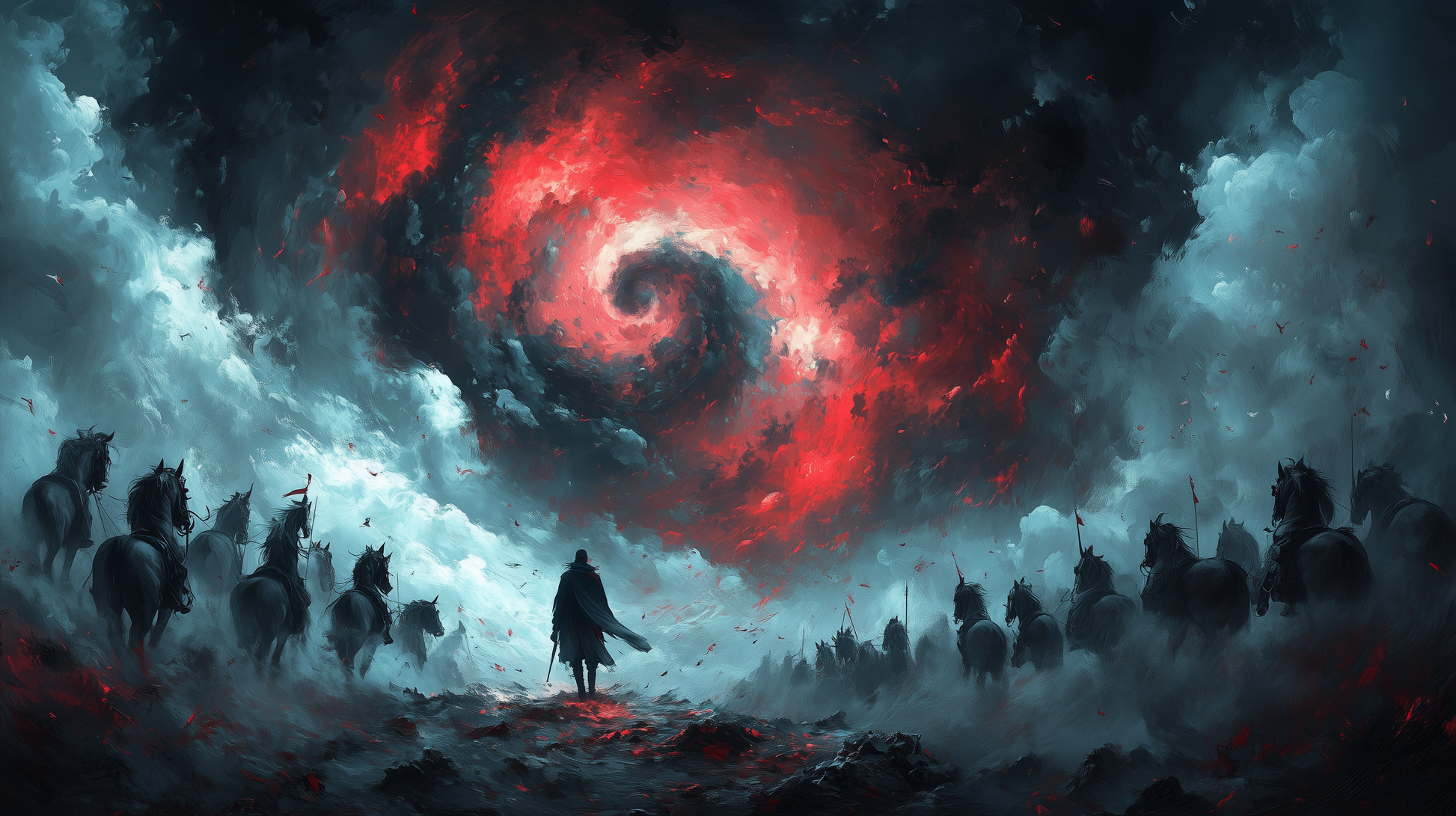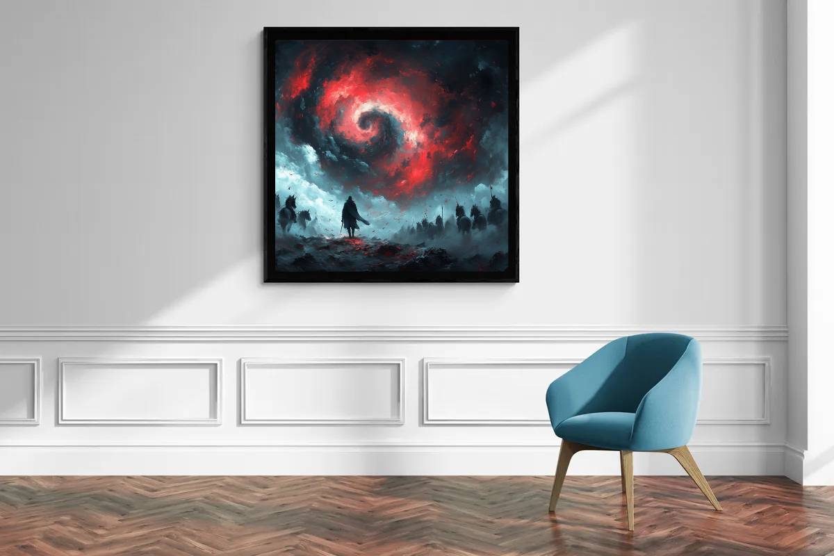 „Wirbel des Schicksals“ ist ein ergreifendes Kunstwerk, das einen dramatischen Moment der Entscheidung und Entschlossenheit einfängt. Mit seinem kraftvollen Zentrum, einem leuchtenden, rot-schwarzen Strudel, und den dunklen Silhouetten von Reitern erzählt dieses Werk von Mut, Hingabe und dem unausweichlichen Lauf des Schicksals.