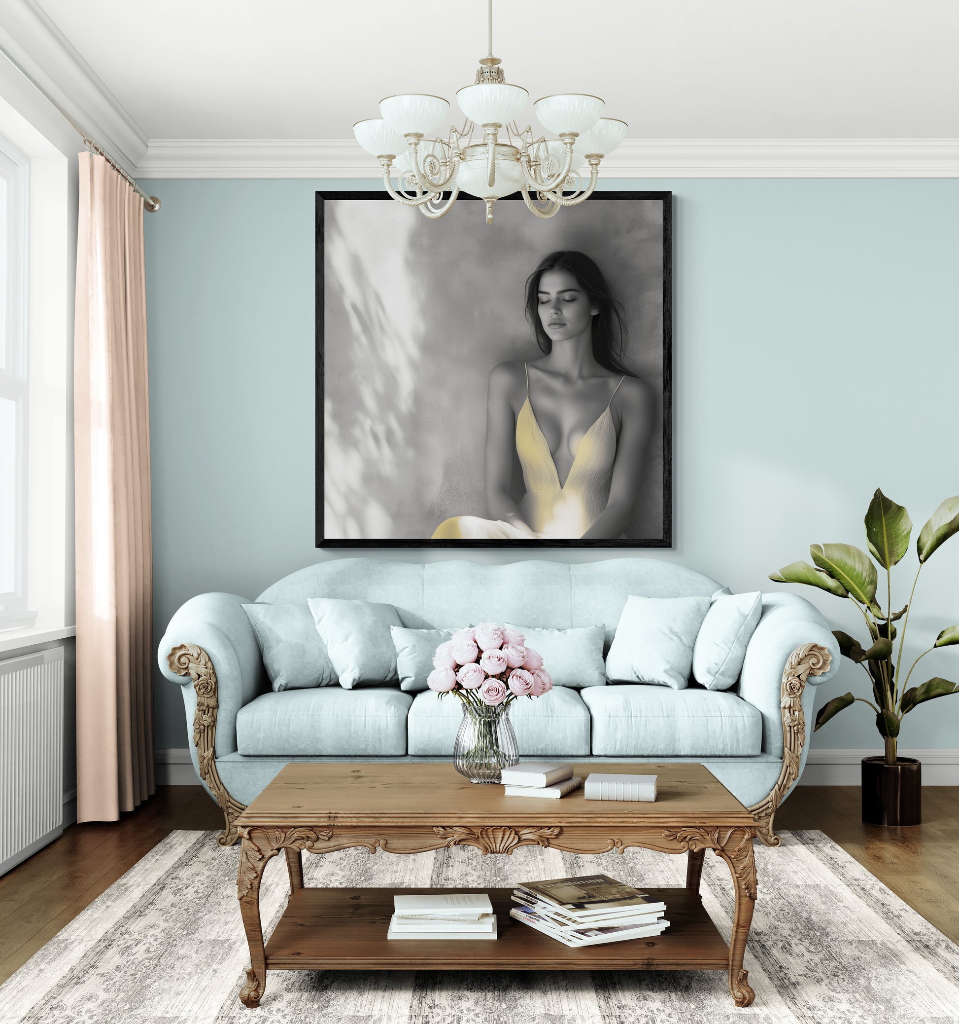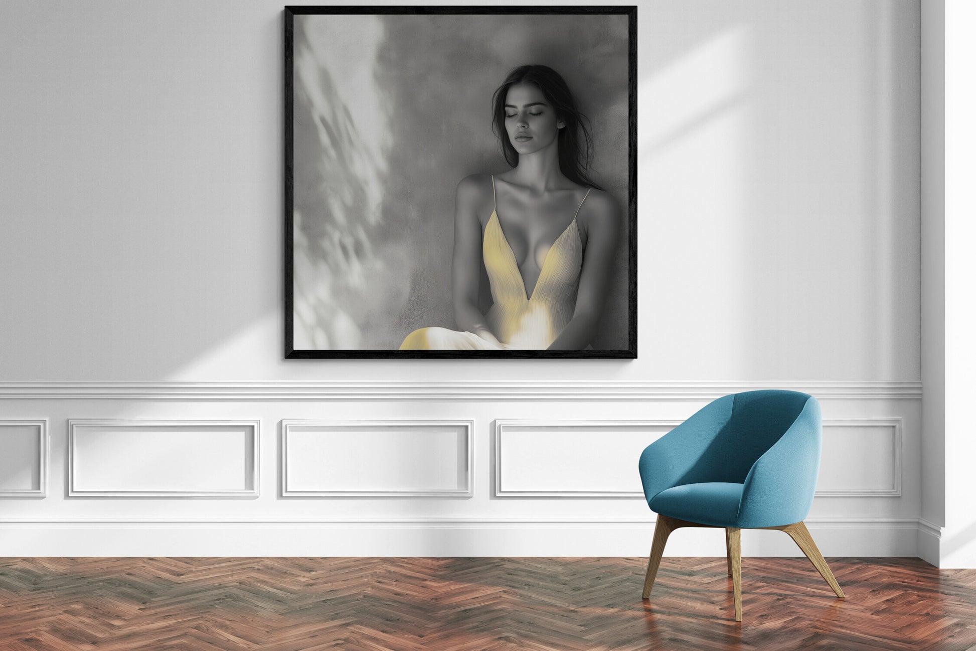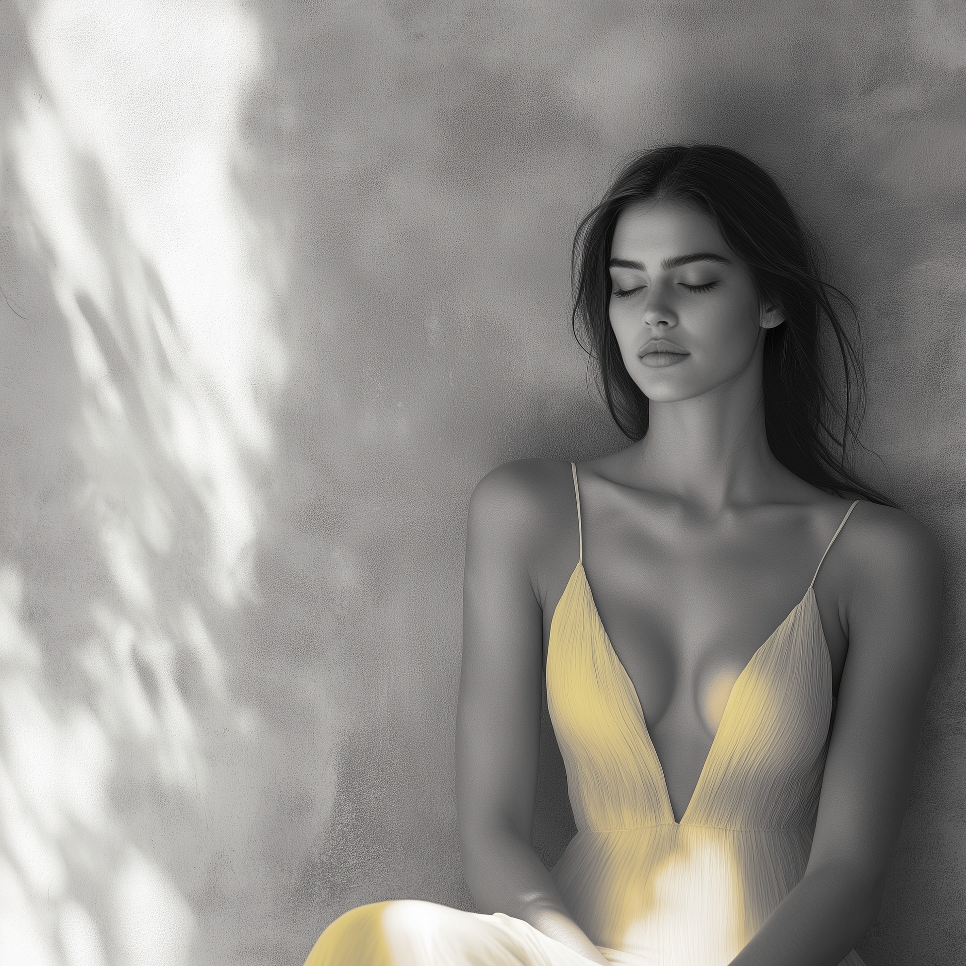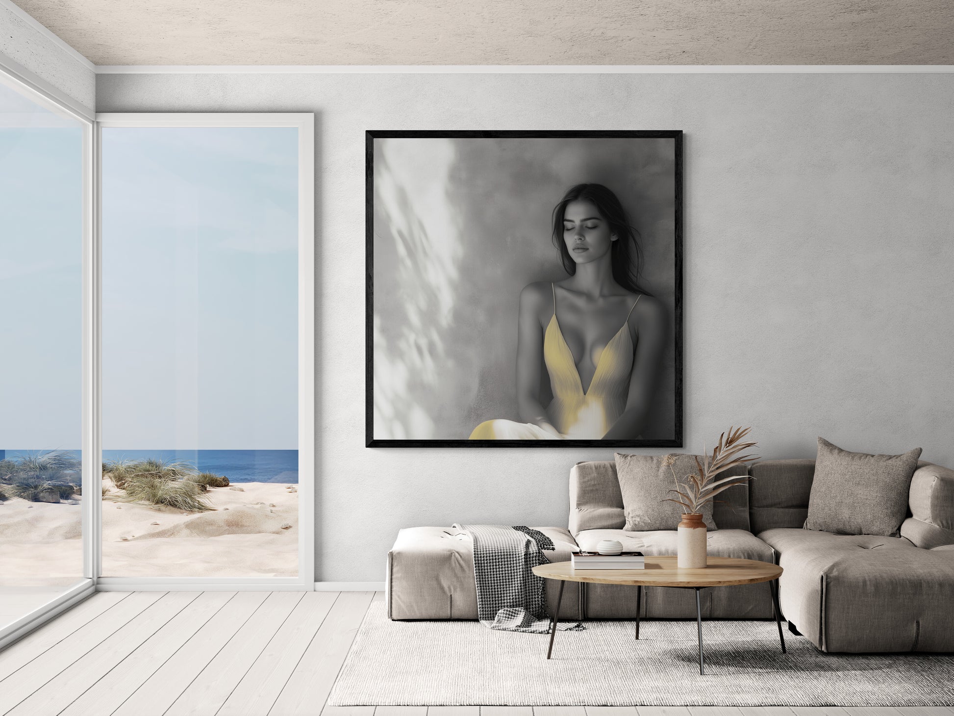 „Zarte Leichtigkeit“ ist ein Kunstdruck -Motiv, das die Harmonie zwischen reduzierter Farbgebung und einem dezent leuchtenden Akzent eindrucksvoll widerspiegelt. Die abgebildete Frau sitzt entspannt mit geschlossenen Augen und trägt ein fließendes, hellgelbes Kleid, dessen Ton sich vor dem ruhig-grauen Hintergrund wie ein freundlicher Sonnenstrahl abhebt. Diese subtile, aber wirkungsvolle Farbinszenierung haucht dem Werk zugleich Eleganz und Gelassenheit ein.