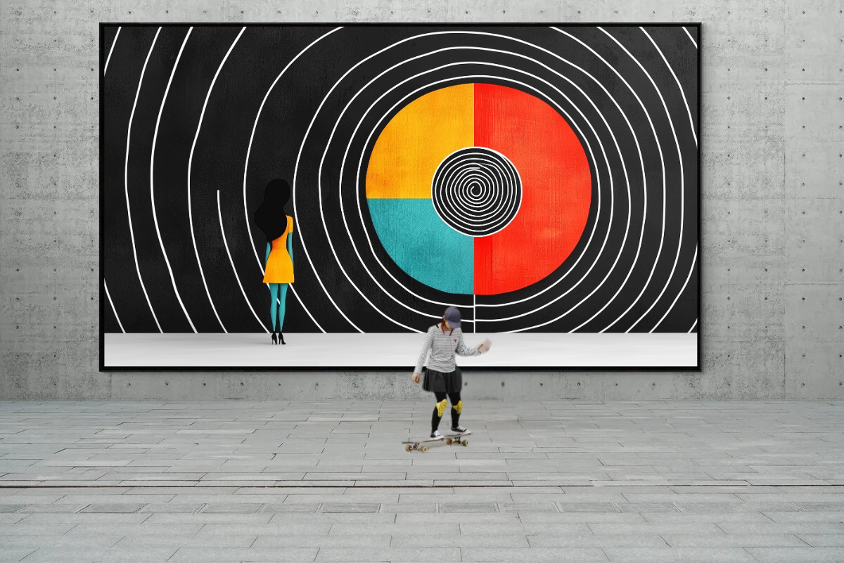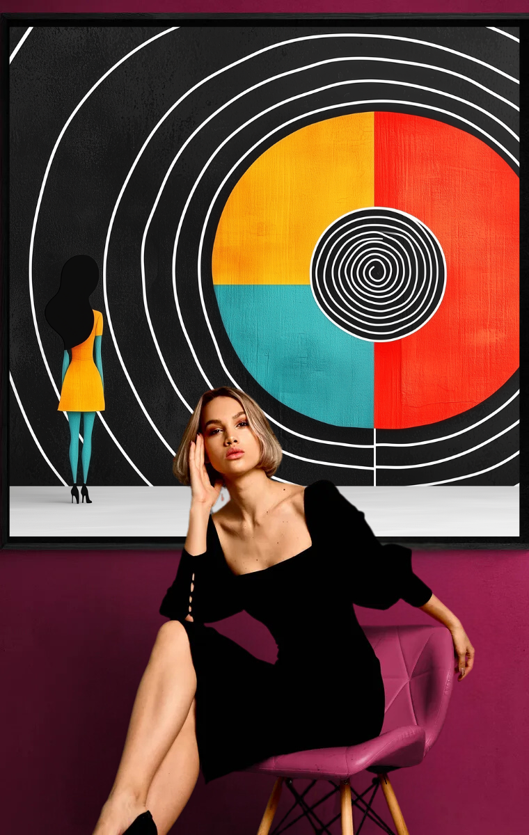 - Retro-Modernität: Die Kombination aus geometrischen Formen und klaren Farben erinnert an einen modernen Kunststil der 60er Jahre und verbindet diese mit einer zeitgenössischen Note.