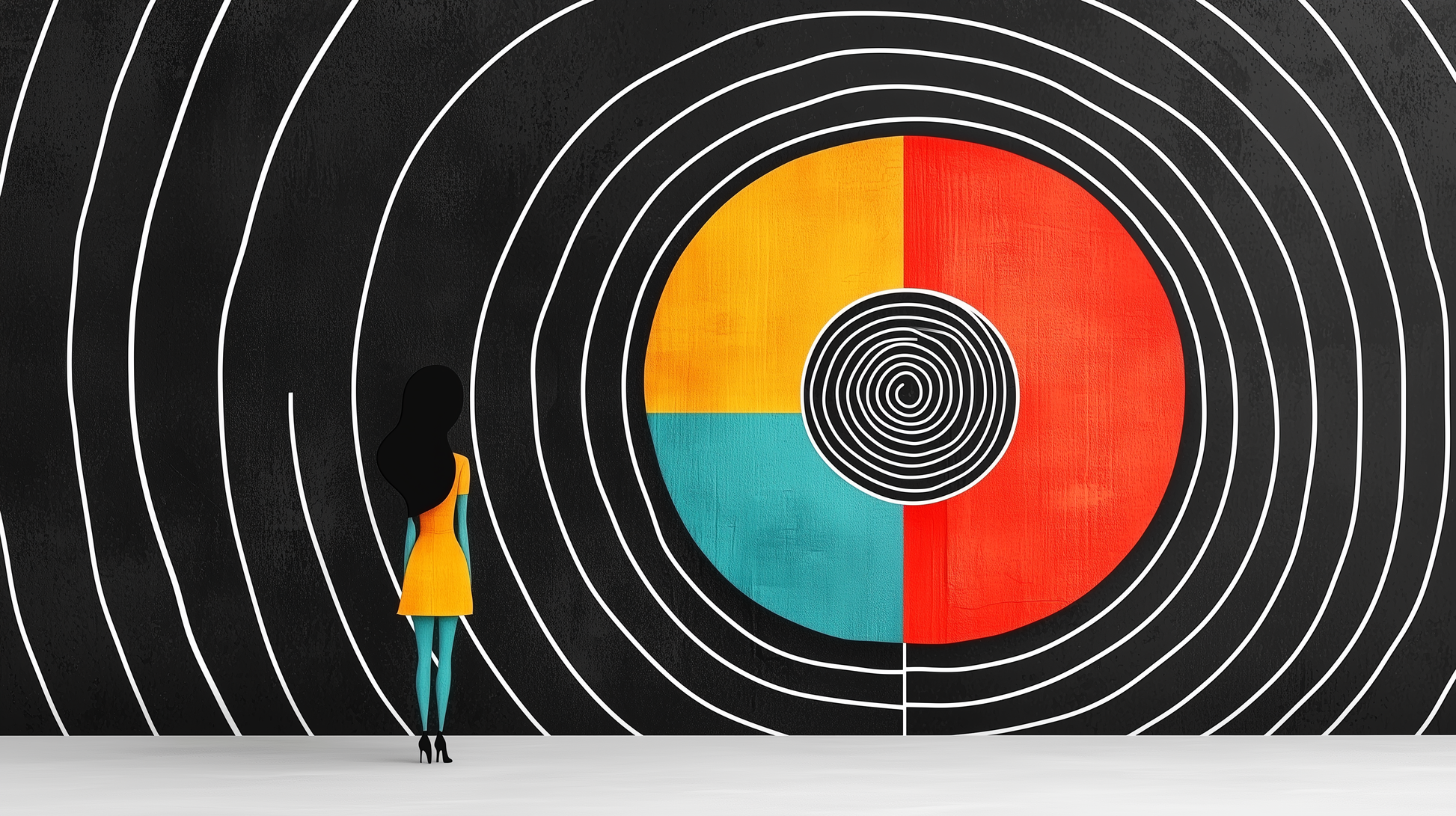 „Zentrum der Möglichkeiten“ ist ein Kunstwerk, das den Betrachter in eine surreale Welt voller Farben und Formen entführt. Eine weibliche Figur in einem leuchtend gelben Kleid steht vor einem großen, konzentrisch angelegten Muster, das mit leuchtenden Farben gefüllt ist. Die Kombination aus Schwarz, Weiß und lebendigen Farben erzeugt eine faszinierende Dynamik, die den Betrachter in ihren Bann zieht. Das Werk symbolisiert das Streben nach Wissen, die Reise zu den eigenen Möglichkeiten und die Entdeckung von Neuem.