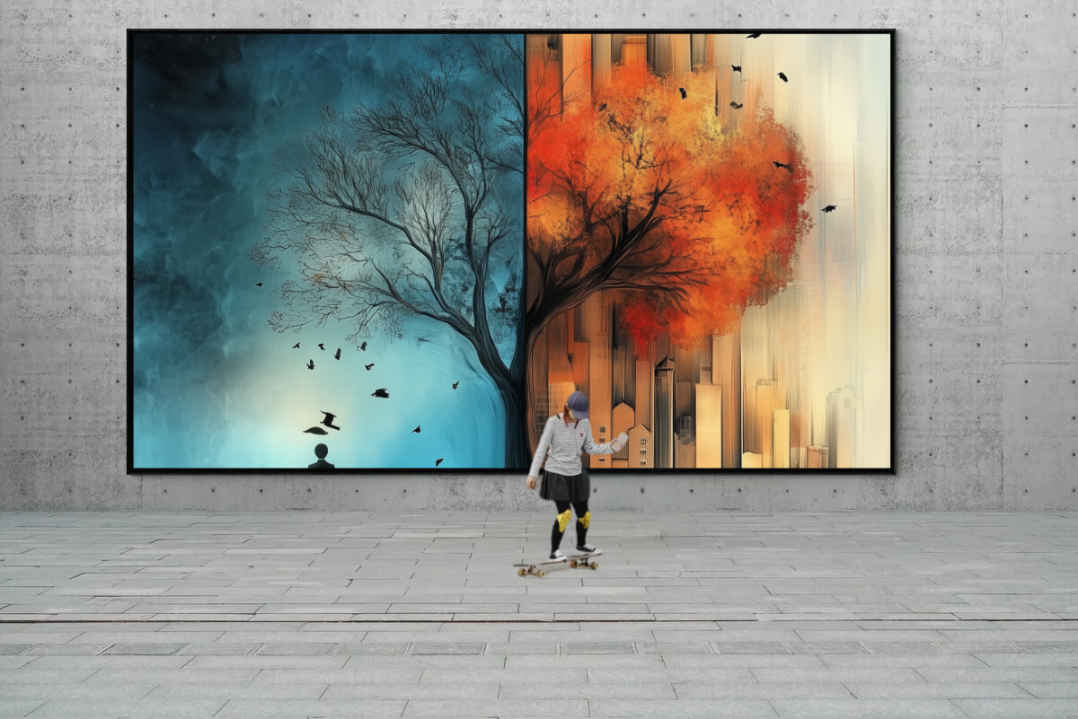 „Zwei Welten“ lädt den Betrachter ein, über seine eigene Position zwischen diesen Gegensätzen nachzudenken. Es zeigt, dass sowohl Natur als auch Urbanität ihre Schönheit und Herausforderungen haben und dass die wahre Kunst darin besteht, ein Gleichgewicht zu finden.