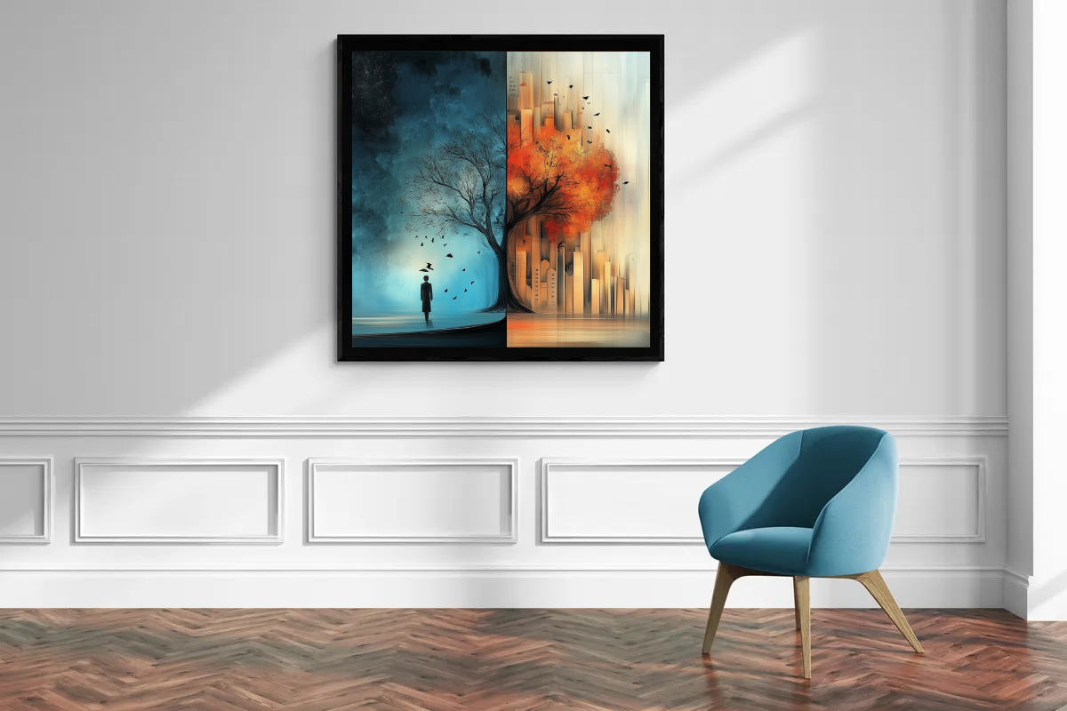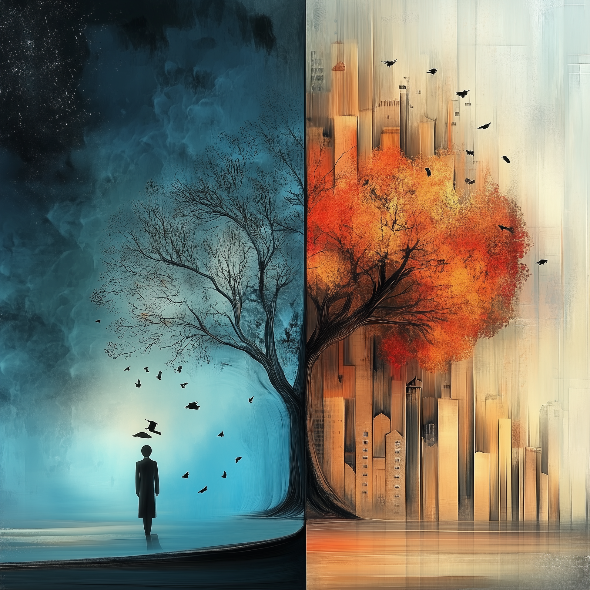 - Die kontrastierenden Welten: Die linke Seite zeigt eine ruhige, neblige Landschaft, die rechte eine lebendige urbane Szene, die von leuchtenden Herbstfarben dominiert wird.