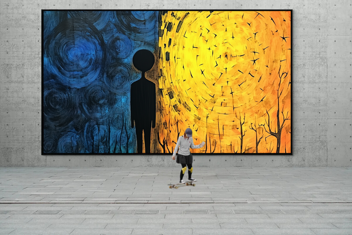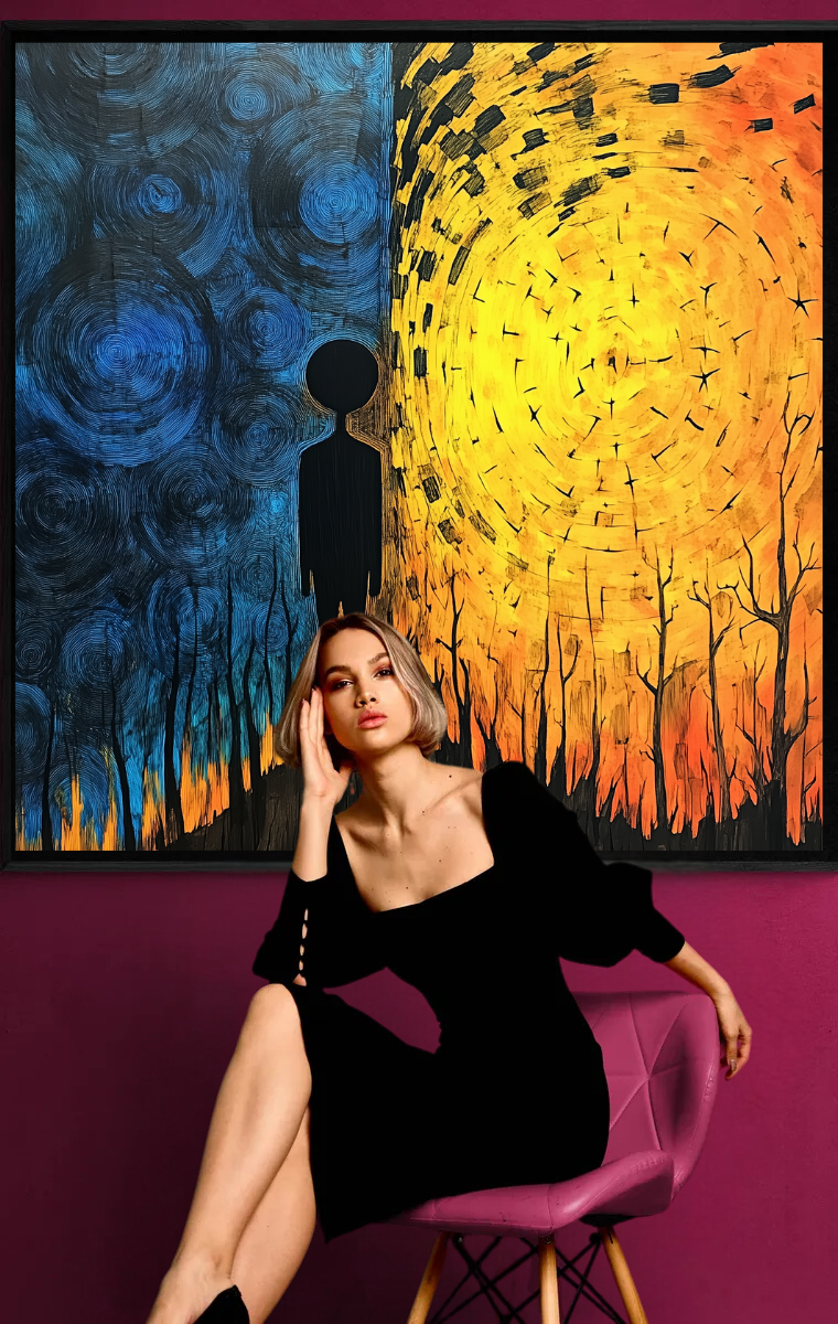 Mit „Zwischen Tag und Nacht“ holen Sie ein Kunstwerk in Ihre Umgebung, das nicht nur ästhetisch beeindruckt, sondern auch die universelle Suche nach Balance und Bedeutung einfängt. Ein zeitloses Stück voller Reflexion und Inspiration.