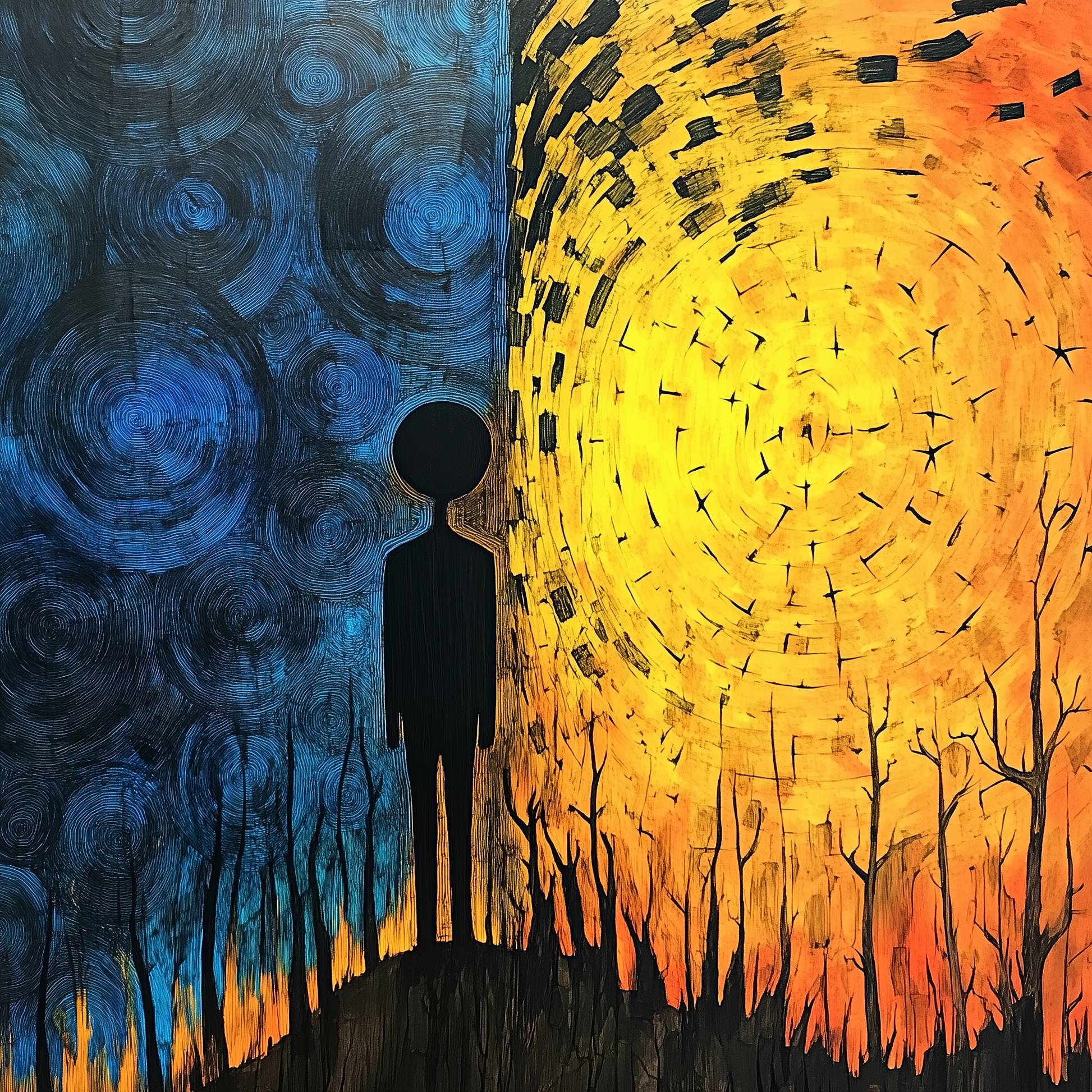 „Zwischen Tag und Nacht“ lädt den Betrachter ein, die Balance in seinem eigenen Leben zu finden. Es ist eine Reflexion über die Dualität des Lebens – Licht und Dunkelheit, Hoffnung und Angst, Aktivität und Ruhe – und wie beide Aspekte uns definieren.